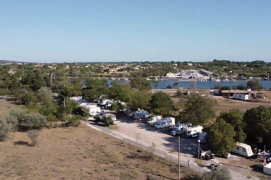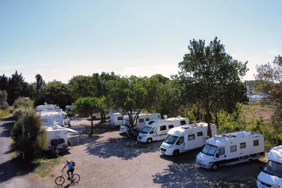 Une aire camping-cars de 25 places, semi ombragée, à l'entrée du camping avec électricité, aire de vidange pour eaux usées et station de remplissage d'eau.